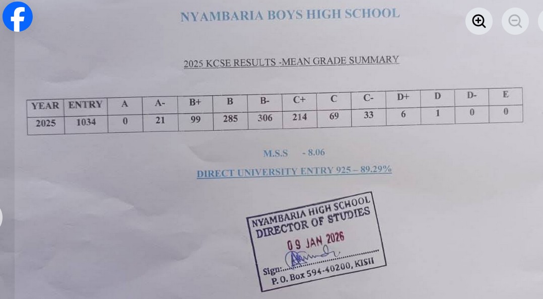 Nyambaria Boys High school did not perform well in 2025 KCSE. The National School did not produce any A plain. Only 21 students scored A- . The mean grade was 8.06