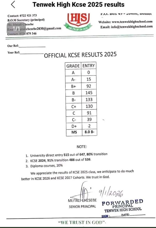 Tenwek High School has registered a mean grade of 8.0 in 2025 KCSE exam. The school produced 15 A- and 92 B+. Below we provide a summary of the result;